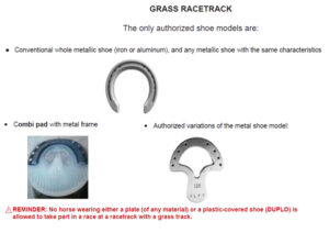 A horse is considered shod when the underside of its foot is fitted with a metal shoe (iron or aluminum) which performs this function throughout race time. Authorized horseshoes in France :